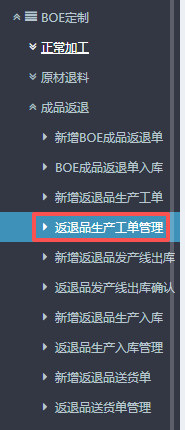 :点晴ERP-BOE返退品生产工单流程![]() 1.进入ERP系统之后,在左侧的功能菜单里找到“BOE定制”,点开“成品返退”,点击“新增返退品生产工单”。