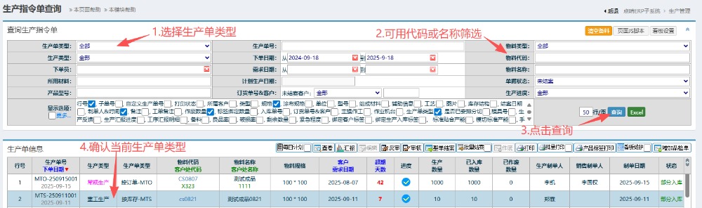 6.进入界面后,按图操作:选择生产单类型,可用代码或名称筛选。点击查询,确认当前生产单类型。