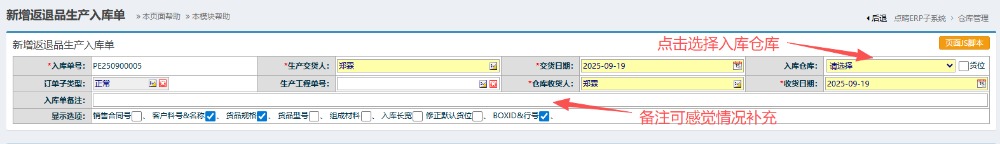 2.进入界面后,按图操作:点击选择入库仓库,备注可根据情况补充。