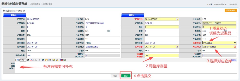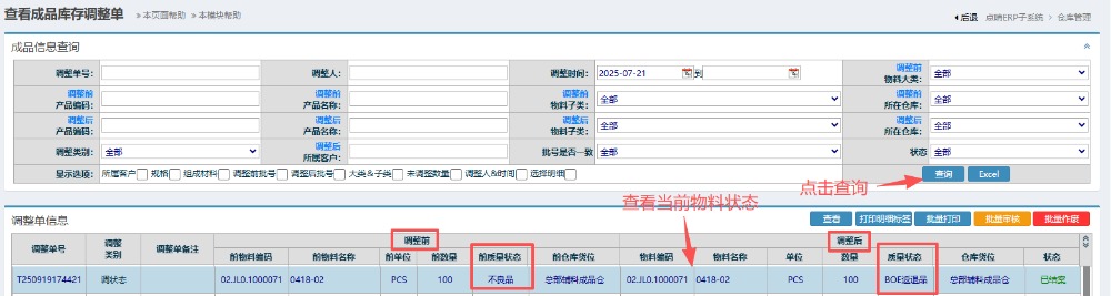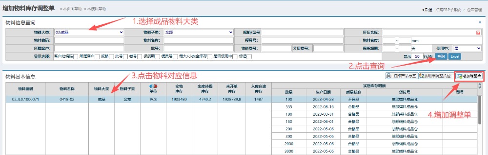 2.进入界面后,按图操作:物料大类选择成品,点击查询。然后点击对应物料信息,点击增加调整单。 在调整单界面内,按图操作:质量状态调整为BOE返退品,调整库存数量以及选择对应的仓库。最后点击提交。
