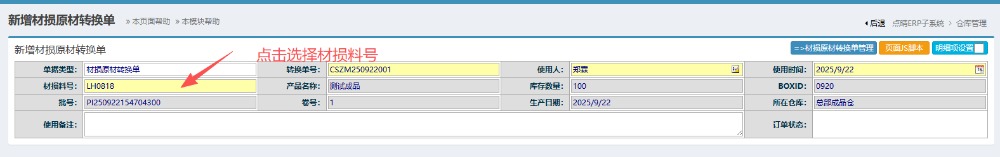 4.提交后,返回到左侧的功能菜单,找到并点击“材损原材转换单入库”