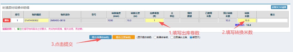 3.选好物料后,填写出库卷数以及转换米数,然后点击提交(根据情况选择“待审核”或“立即入库”)。