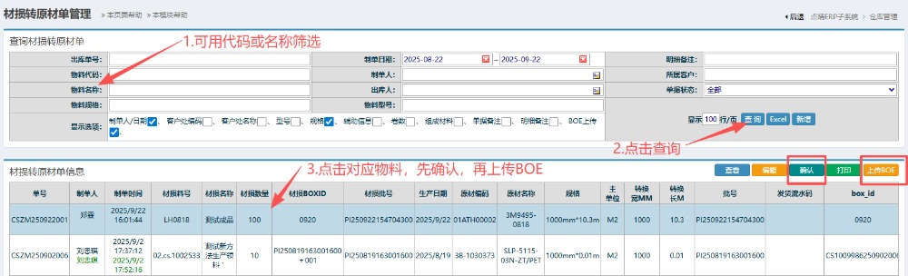 5.进入界面后,按图操作:可用代码或名称筛选物料,然后点击查询。点击对应物料信息,先进行确认,再上传BOE。