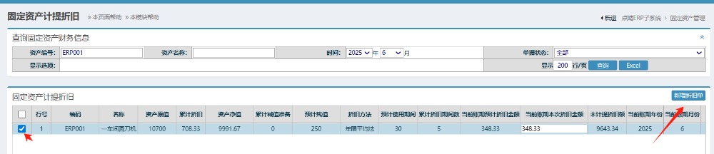 勾选上要生成折旧单资产明细,再点击新增折旧单按钮 如下图: