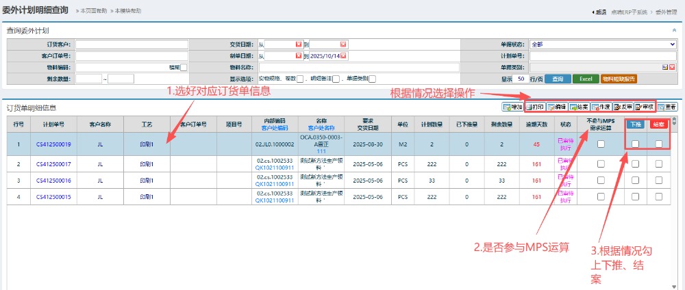 3.在下方会显示对应订货单信息,选好对应订货单信息,根据情况选择对应操作(打印、审核、编辑等)以及是否参与MPS运算,然后在点击勾上下推或者结案。