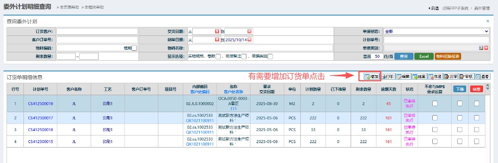 注:如果不了解MPS运算可以点击下方链接进行了解: 请简单介绍一下什么是MPS(主生产计划)http://13297.oa22.cn 4.如果有需要增加委外加工计划的话,可以按下图操作:点击增加