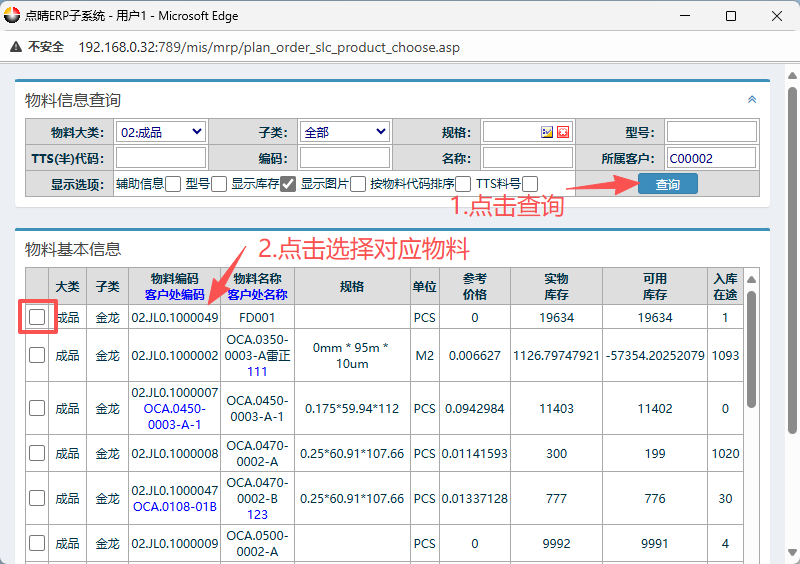 选好客户后,在下方点击“物料编码”,弹出对应窗口。 在窗口内点击查询,然后点击选择对应的物料信息。