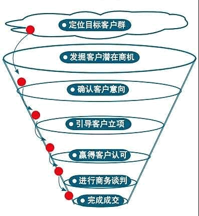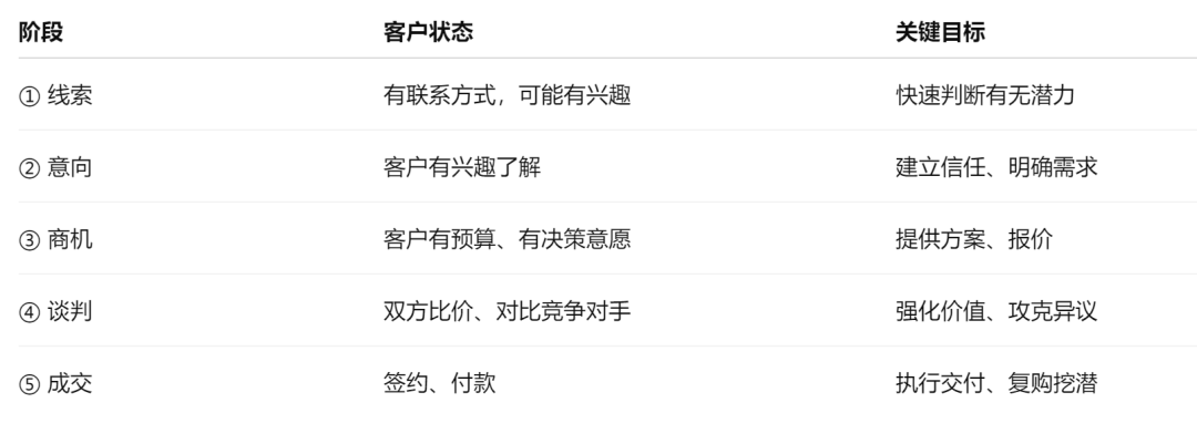 这就是“漏斗”的形状——越往下越少,漏斗的意义就在于: 让你知道客户掉在哪,掉多少,为什么掉。 如果你不看漏斗,所有客户都堆成一团,你根本分不清问题出在哪个环节。 ![]() 02 漏斗的底层逻辑:销售是过程管理 很多人把销售当成“个人能力游戏”——谁嘴皮子厉害,谁人脉多,谁关系广,但优秀的企业早就明白一个道理: 销售不是玄学,是可管理的过程。 销售漏斗就是把“成单的过程”拆成一个个可以量化、可以优化的阶段。我们可以把销售看成五个阶段: ![]() 每个阶段都对应不同的动作和策略。如果你不分阶段,只知道“客户很多”,那根本不知道该怎么推进。 而销售漏斗,就是让你把客户分层管理,知道: