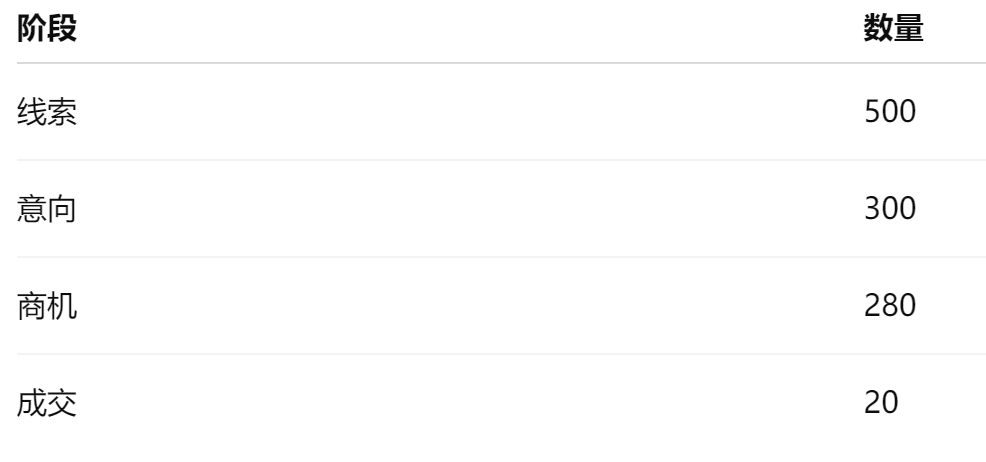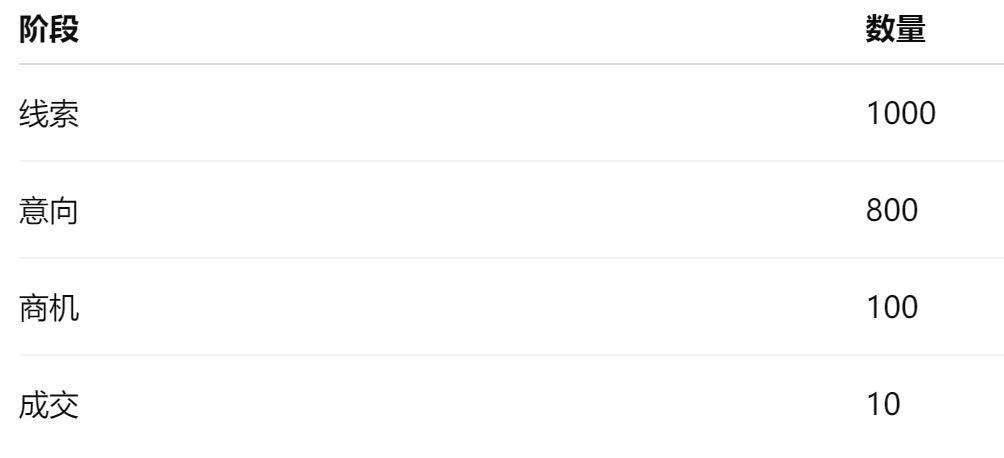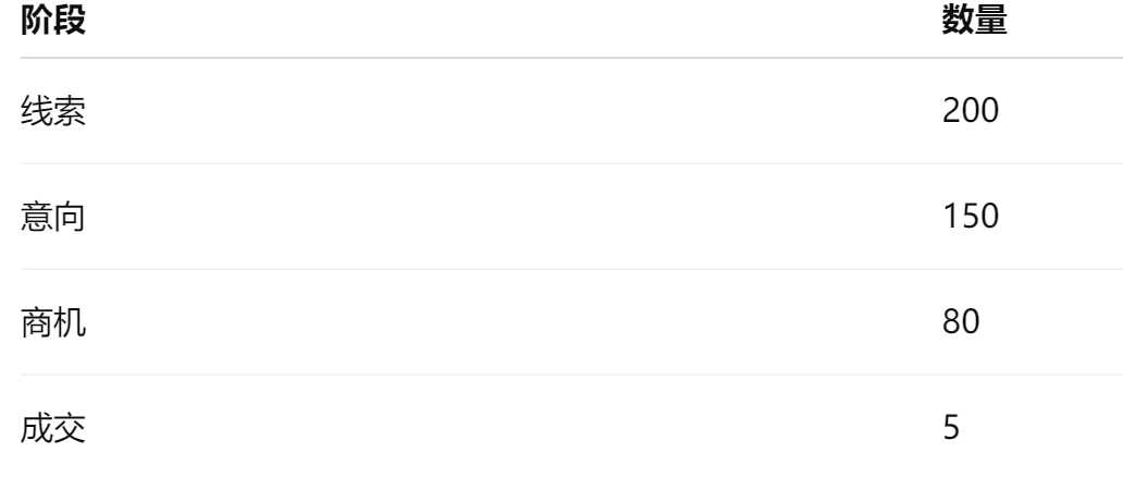 ——但月底一看业绩,啪啪打脸。 漏斗的好处是,它能让销售变得可预测、可诊断、可优化。 1. 可预测:用漏斗反推业绩目标 假设你历史数据是这样: