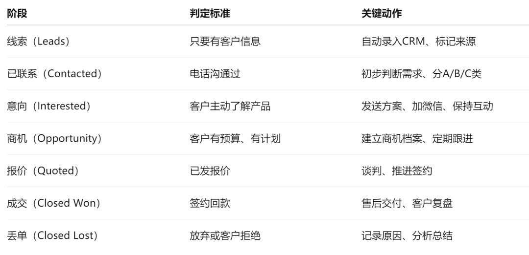 漏斗就像X光,帮你看到销售体系的骨架。 3. 可优化:用数据驱动决策 很多公司盲目加人、加预算,其实根本不是人不够,而是过程效率太低。 比如你发现意向客户太多但没人跟,那不该去招更多销售,而是该优化CRM流程、自动提醒机制。 漏斗数据让管理从“拍脑袋”变成“算出来”。 ![]() 05 销售漏斗怎么搭才合理? 漏斗不是标准答案,每个企业都得自己定义阶段。举个B2B销售漏斗的实用版本 ![]() 关键是统一标准。 团队里每个人都得知道什么叫“意向”,什么叫“商机”。 不然一个人觉得“加微信”算商机,另一个人觉得得“见面”才算——那漏斗数据全乱了。 ![]() 漏斗管理落地的三步法 漏斗想真正有用,不是画图、喊口号,而是要落地三步走: 第一步:真实的数据 这一步是地基。 漏斗数据必须真实,否则分析出来全是幻觉。