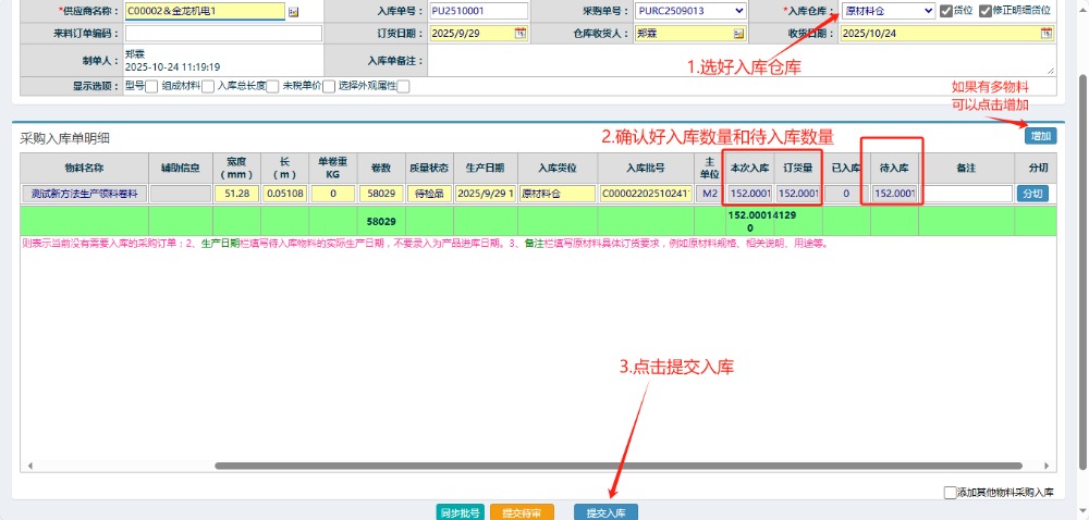 3.点击入库后跳转到”新增采购入库单“页面,按图操作:选好入库仓库,确认好入库数量和待入库数量,最后点击提交。 注:如果有多物料的话可以在右上点击增加。