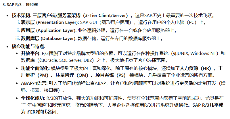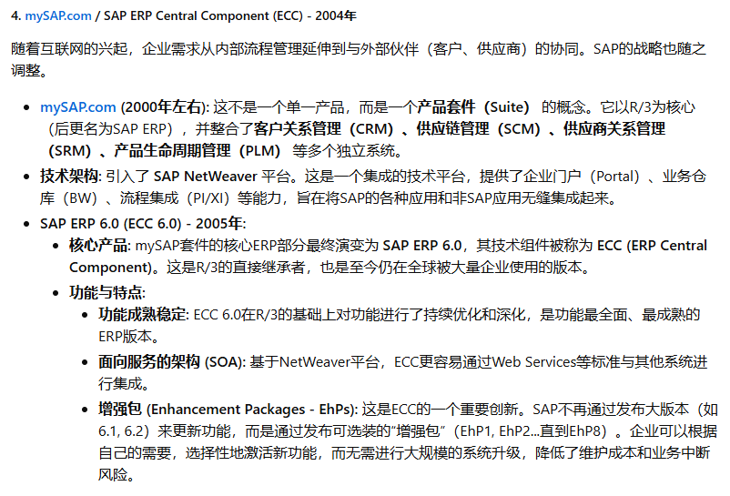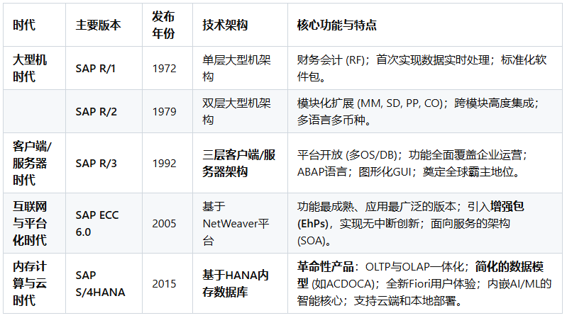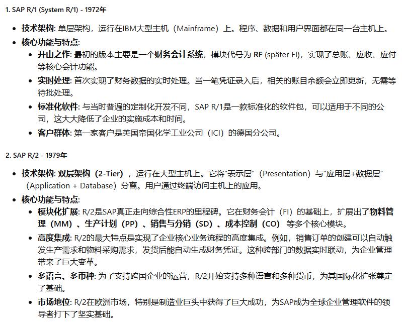 SAP(Systeme, Anwendungen und Produkte in der Datenverarbeitung,即“数据处理中的系统、应用和产品”)公司于1972年在德国魏恩海姆(Weinheim)成立。其创始人是五位前IBM公司的工程师:Dietmar Hopp, Hans-Werner Hector, Hasso Plattner, Klaus Tschira, 和 Claus Wellenreuther。他们的核心理念在当时是革命性的:开发能够实时处理业务数据的标准化商业软件。在那个年代,数据处理通常是批处理模式(Batch Processing),即数据被收集起来,在夜间或非高峰时段统一处理,管理者第二天才能看到报表。SAP的“实时(Real-time)”理念,旨在让企业在数据产生的那一刻就能进行处理和分析,为管理决策提供即时支持。这个初心贯穿了SAP产品演进的始终。SAP的ERP产品历程,是全球企业信息化发展的缩影,大致可以分为以下几个关键时代: 第一阶段:大型机时代 - 奠定基础 (1970s - 1980s) 第二阶段:客户端/服务器时代 - 称霸全球 (1990s) 第三阶段:互联网与平台化时代 - 延伸与整合 (2000s - 2010s) 第四阶段:内存计算与云时代 - 智能与简化 (2015年 - 至今)希望这份详尽的解读能够帮助您全面了解SAP ERP产品波澜壮阔的发展历程。