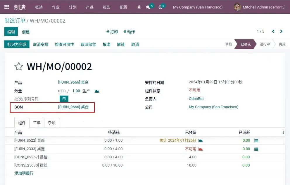 制造订单(MO):也称为生产订单,该文件授权在预定时间内生产指定数量的产品。制造订单安排实际生产,从物料清单中提取信息,以计算完成订单所需的组件和作业细节: