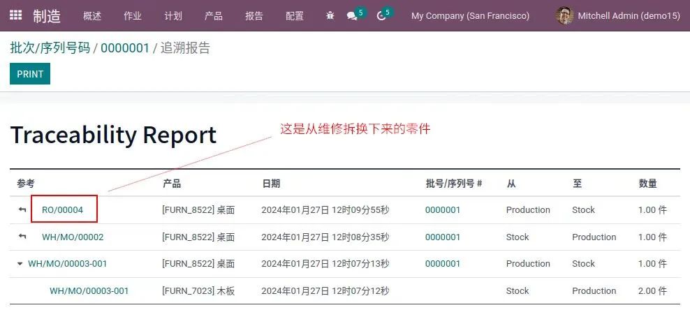 当准备好制造产品时,物料批次和序列号用于编制物料清单中的必要组件,并从仓库转移到生产车间进行生产。一旦产品完成,就会有一份记录显示所使用的确切零件。更复杂的制造方法也可以配置为需要拣取组件,然后存储产品。无论用何种方法,物料的移动都是透明的,可以通过追溯报告查看: