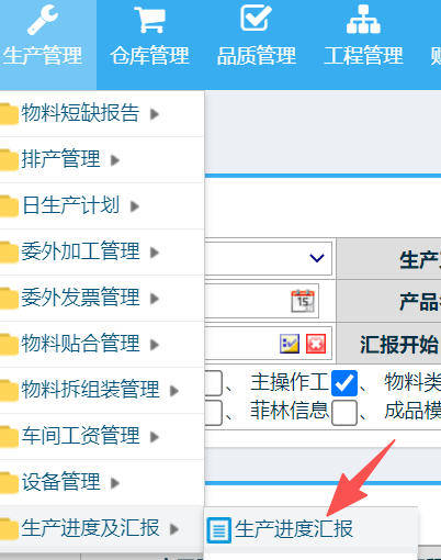 操作步骤:生产管理-生产进度及汇报-生产进度汇报