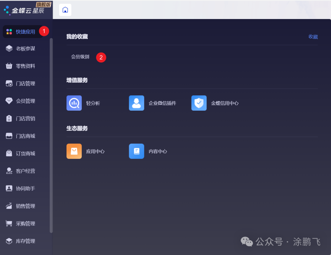 接下来,我将带领大家去查看金蝶云星辰旗舰版各个功能菜单的去全貌。 快捷应用![]() 快捷应用提供了我的收藏、增值服务、生态服务功能。其中我的收藏可以将常用的功能收藏于此,后续可以通过此链接直接快速进行对应的功能页面。 老板看板![]() 老板看板主要提供了利润分析和资金分析这两块针对小型企业非常重要的功能,小型企业一般处于发展阶段,主要为赚取利润为主,同时要保证现金流的正常。 门店管理![]() 门店管理的功能非常丰富,有零售单、预计寄存、门店补货、销售报表、店务报表、轻餐管理者几大核心功能子模块。 ①零售单:负责门店零售业务,包含零售单、结存单,管理现金缴款、收银员交接班及开票、发货等,是门店销售的核心操作入口。 ②预订寄存:管理预订与寄存业务,涵盖预订单、订金记录及核销,同时处理寄存单、流水与商品汇总,还支持门店直配,支撑门店预订类服务。 ③门店补货:统筹门店补货流程,包含要货单、配货单、发货单,支持返配申请、统一调拨及店间调拨,保障门店库存补给高效。 ④销售报表:统计门店销售数据,含零售单明细、销售汇总表、收银日报、销量统计等,还能跟踪预订单与挂单,助力销售进度监控。 ⑤店务报表:记录门店后勤数据,涵盖要货日报、明细 / 汇总表、配货汇总表及出货差异明细,辅助门店补货与库存管理的复盘。 ⑥轻餐管理:支撑轻餐类门店运营,包含扫码点单、桌位 / 区域管理,对接外卖订单,同时管理平台券授权、核销及增值服务购买,适配轻餐场景需求。 金蝶云星辰门店管理模块从零售、预订、补货,到销售统计、店务记录、轻餐运营,构建了门店全场景管理体系,保障门店日常运营高效有序。 会员管理![]() 会员管理是金蝶云星辰系统中提升客户粘性与运营效率的重要模块。 ①会员资料:管理会员核心信息,包含会员级别、信息、储值 / 积分账户,同时配置级别折扣、共享组、升降级规则,是会员管理的基础信息载体。 ②积分:运营会员积分体系,涵盖积分记录、流水,可设置基础 / 高级积分、抵现、清零规则,支持积分兑换商品 / 优惠券,实现积分的全流程管控。 ③储值:管理会员储值业务,包含充值赠送规则、储值记录 / 流水 / 核销,同时支持充次、储值支付限额、储值转换,助力储值类会员权益的精细化运营。 ④服务:支撑会员增值服务,涵盖微信公众号授权、会员卡设置,记录会员分享信息,同时配置公众号消息提醒,提升会员服务体验。 ⑤赊账:管理会员信用赊账,包含还款方案、授信 / 赊账记录、信用流水,同时跟踪第三方挂账的应收与核销,规范会员信用交易。 ⑥会员分析:提供会员数据洞察,含会员分析表、客群分析表,助力评估会员结构与行为,辅助会员运营策略优化。 金蝶云星辰会员管理模块从资料管理、积分储值,到服务、赊账、数据分析,构建了会员全维度管理体系,提升会员运营效率与粘性。 门店营销![]() 门店营销是围绕线下实体门店展开的一系列推广与销售活动,核心是吸引客流、提升到店转化率与复购率,金蝶云星辰门店营销主要包含以下: ①促销 / 优惠券:管理零售促销与优惠券,涵盖优惠券的领、核、销全流程,同时记录优惠券流水,是门店短期促销的核心工具。 ②礼品卡券:运营礼品卡券业务,包含礼品卡 / 券方案设置,以及消费、核销、转移等流水记录,助力卡券类营销的精细化管理。 ③会员营销:开展会员精准运营,提供精准营销、入会有礼、生日有礼等功能,通过个性化福利提升会员粘性。 ④短信服务:支撑营销消息触达,可配置提醒设置,记录短信发送轨迹,同时支持短信购买,助力营销信息的及时推送。 金蝶云星辰门店营销模块从促销工具、卡券运营、会员维护到消息触达,构建了门店全维度营销体系,提升门店获客与留客能力。 门店商场![]() 门店商场模块主要是针对企业有大量门店管理的业务设计开发的。聚焦门店线上商城的运营管理:涵盖商品资料与分组管理,可配置商城首页方案、配送规则及整体商城参数;支持商城订单处理,能设置时段限量销售,管理运费模板,同时可维护小程序发货信息。 订货商城![]() 订货商场是面向经销商、零售商等 B 端客户的线上订货交易平台,连接品牌方或供应商与下游渠道。主要包含以下功能清单: ①订货管理:负责订单全流程操作,包含订单确认、支付记录、订单优惠,同时管理运费模板、自提点等,处理到货签收、商品限购与支付退款,是订货业务的执行入口。 ②商城管理:配置商城基础功能,涵盖搭建指南、系统配置、页面方案、小程序 / 公众号设置,还能管理支付与消息提醒,是商城运行的基础支撑。 ③商品管理:管理商城商品信息,包含商品列表、分类、品牌,同时配置客户价格策略,支撑商品的线上展示与定价。 ④客户管理:维护商城客群,涵盖客户列表、等级管理、潜在客户及用户管理,同时设置登录限制,实现客群的分层运营。 ⑤营销:开展商城推广活动,包含批发促销、优惠券、在线推广、小程序直播等,助力提升商城订单转化。 ⑥积分:管理客户积分体系,涵盖积分账户、设置、规则、抵扣及记录,通过积分激励增强客户粘性。 金蝶云星辰订货商场模块从订货执行、商城配置到商品、客户、营销、积分管理,构建了线上订货商城的全流程运营体系。 客户经营![]() 客户经营模块,其实类似与一个简易版的CR
