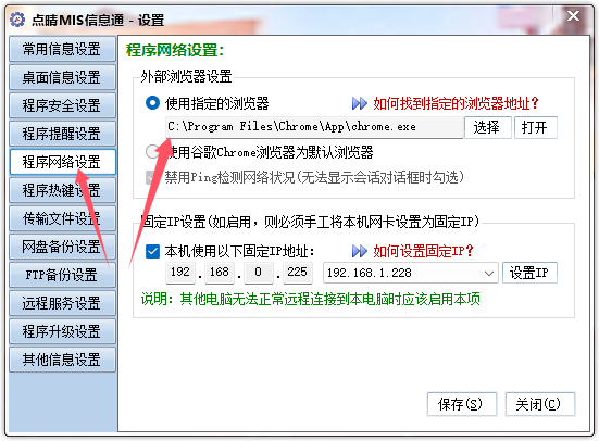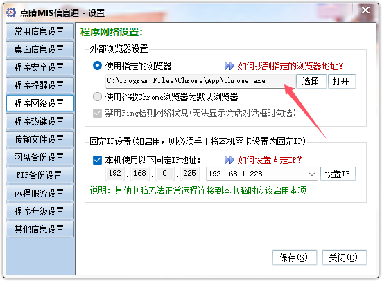 找到“程序网络设置”,勾选“使用指定的浏览器”,然后点击选择浏览器所在位置,保存即可。