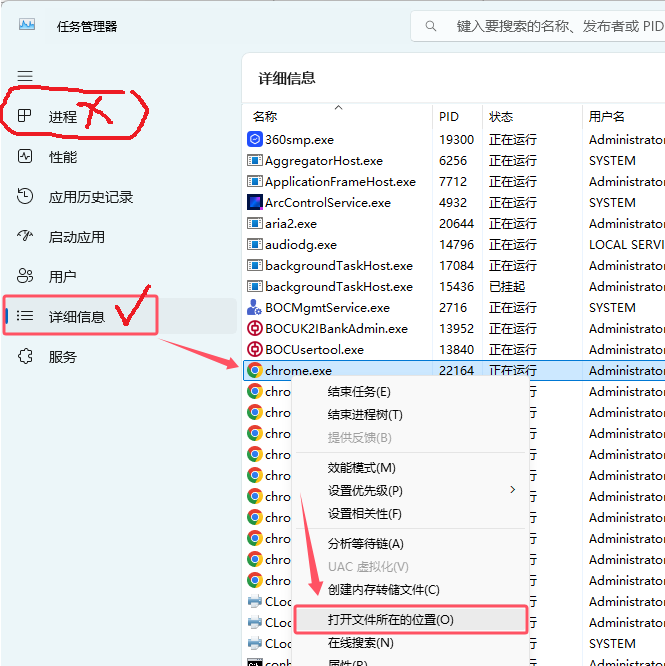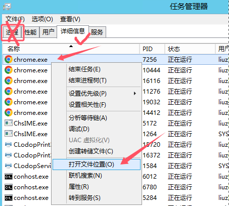 选中“详细信息不要在“进程”中点击谷歌浏览器,进程中谷歌浏览器菜单“打开文件所在的位置”是灰色的,无法选中,找到谷歌浏览器进程:chrome.exe,点击鼠标右键,在弹出菜单中选择“打开文件所在的位置”: