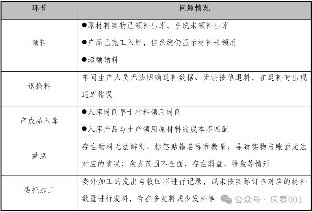 应对处理上述问题的产生,需对存货流转各环节、节点进行梳理、确保存货管理按制度执行,考验企业自身管理经营水平并涉及多个部门,其整改难度远高于情形一。就实务经验而言,针对问题相对集中的几个层面,管理建议如下: (1)优化工单领料规则 工单领料不准确,领用、替换、退料未审批等历来为存货管理的“重灾区”。结合项目案例的优秀管理经验,建议公司于工单领料环节,做好如下改进工作: