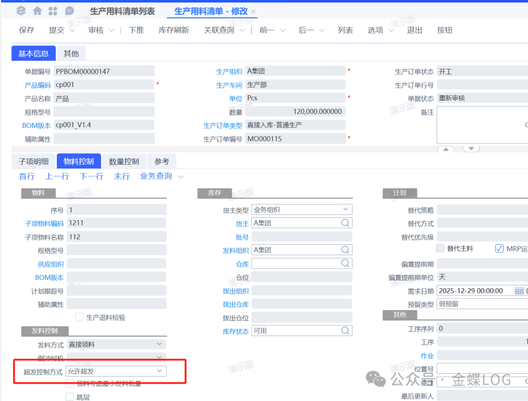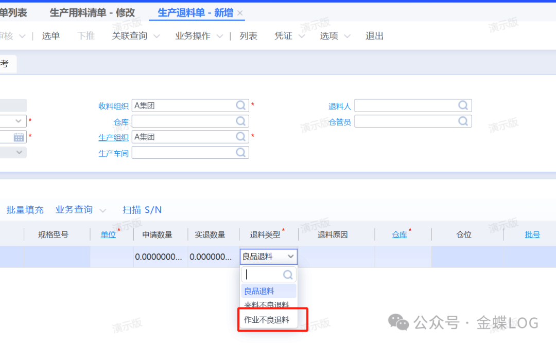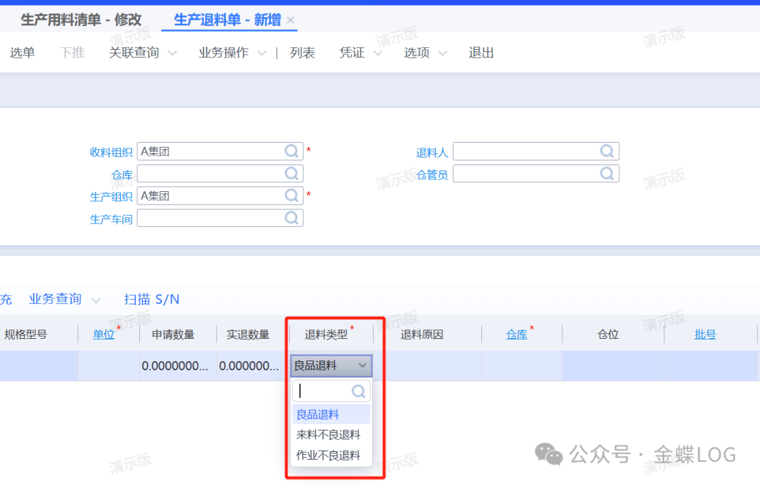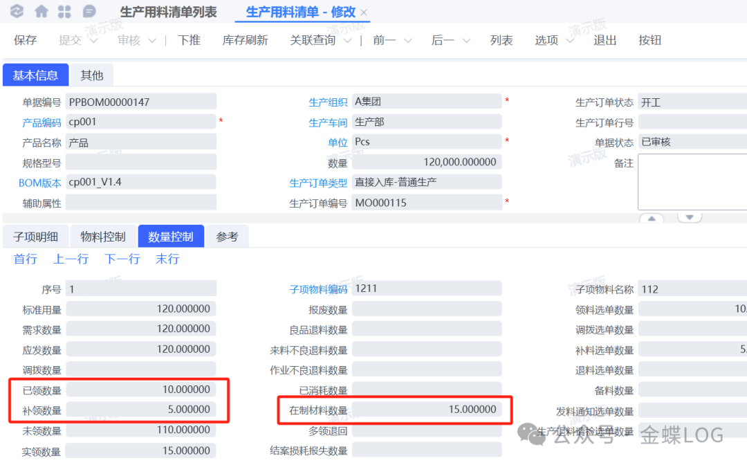 ①生产领料单和生产补料单在系统上的作用。 ②生产领料单和生产补料单对生产用料清单的影响。 ③生产领料单和生产补料单在成本上的处理。 A 问题解答 一、在系统上的作用和对生产用料清单的影响。 ①生产领料单发的是计划内的需求,也就是用料清单的应发数量;领料单在审核之后会反写用料清单的【已领数量】字段,并且会扣减【未领数量】字段; ![]() 生产补料单发的是计划外的需求,也就是一些超领动作;补料单审核后会反写用料清单的【补领数量】字段,不会扣减【未领数量】字段。 ![]() 但是这两个单据都会增加用料清单的【在制材料数量】,也就是说你需求是100个,生产领料单领了90个,生产补料单补了10个;也是能够入库100个的产品。 ![]() ②生产领料单下推出来的数量会受生产用料清单【发料控制】下的参数影响,而补料单不会。 ![]() ③在生产退料之后,是做领料单还是补料单也有区分。主要看退料单上的【退料类型】选的是什么; ![]() 如果选的是【良品退料】和【来料不良退料】,会扣减生产用料清单的【未领数量】(前提是没有勾选【不更新未领】),这时需要通过生产领料单再次出料; ![]() 而选的是【作业不良退料】的话,不会更新【未领数量】,但是会扣减【在制材料数量】,再次领料需要下推生产补料单; ![]() 如果【作业不良退料】你也要走生产领料单,那生产用料清单超发控制方式只能是选择【允许超发】。因为生产领料单发的是需求内的,作业不良一般是产线导致的损耗,正常走的是补料单。
