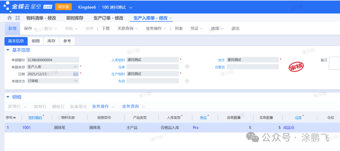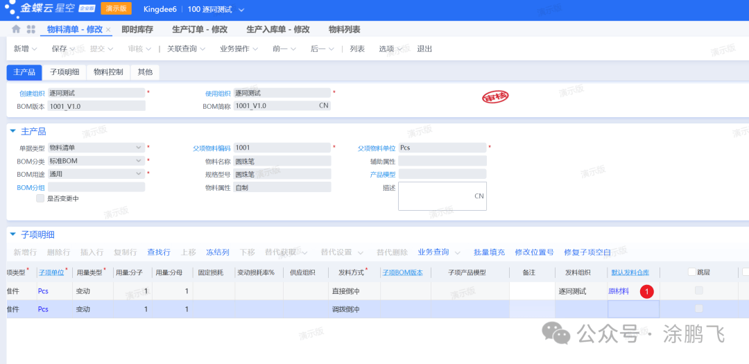 在我们工作中,或者在项目实施过程中,经常会听到倒冲这个词语,在生产发料这个业务环节,倒冲也是绕不开的一个词,有些地方叫倒冲,有些地方称之为反冲,其实都是一个概念。 倒冲是一种事后扣减的方法,常见于生产完成后系统自动扣除原材料库存。 那在我们的生产制造环节上哪些业务会应用到倒冲领料呢? 在生产过程中,对于一些价值低、共用性强、不易拆包的材料,如包材、螺丝、海绵等,许多企业针对这类物料的生产发料都会采用倒冲的方式进行处理。 还有一些标准化程度非常高的离散制造企业,其BOM的标准用料设计的非常合理几乎无损耗,并且整个车间的业务流程非常规范,如手机组装、家电生产等头部企业,经常也会采用倒冲发料的方式进行管理。 或者其他业务场景?大家可以进行一个思考和反推! 倒冲领料优缺点倒冲领料可以简化车间作业流程、提升效率,消除了大量的琐碎的领料发料记账等工作,让工人专注于生产,当然还有其他很多好处。 但是倒冲领料高度依赖精准的BOM结构、高度的标准化生产流程、精益的车间生成制造管理等,要不然实施倒冲领料也可能造成以下后果。 库存混乱,一旦基础数据如BOM不准,将对整个生产造成灾难性的影响,且倒冲领料不适合复杂或者定制化生产,尤其是项目制的生产是无法使用倒冲领料的。 倒冲领料料是一种 “结果驱动” 的物料管理方法,用流程的事后简化换取了过程透明度的降低。它就像一台高效的自动扣款机,但前提是你必须保证放入其中的“规则”(BOM)和“指令”(完工数据)绝对正确,且整个消费环境(车间)高度规范。否则,它扣错账的速度和效率也同样惊人。 金蝶云星空倒冲领料解析在金蝶云星空里面,倒冲领料有两种方式,直接倒冲和调拨倒冲。 直接倒冲:原材料从仓库发往车间时,在系统上不做任何库存移动。物料在系统中始终显示在“仓库”里,直到产品完工时,系统才根据BOM和完工数量,直接从仓库库存中扣减,并计入生产成本。直接倒冲一步到位! 调拨倒冲:原材料从仓库发往车间时,先在系统上做“调拨”,将物料从“原材料仓库”转移到“车间线边仓”(或“在制仓”)。此时,物料的所有权从仓库转移到了车间。产品完工时,系统再根据BOM和完工数量,从“车间线边仓”中扣减这些物料,并计入生产成本。调拨倒冲两步到位! 接下来我们通过一个案例和实操,来展示直接倒冲和调拨倒冲在金蝶云星空系统中的实际应用。 首先我们需要在BOM上设置好物料的发料方式、设置车间仓库、单据类型参数等。。 ![]() 设置车间对应的仓库,以提供调拨使用,这里要注意,仓库的需要设置成车间仓库类型。 ![]() ![]() ![]() 接下来,我们直接下一个生产订单看看,如下图所示,进入生产订单界面,选择生产车间,需要生产的产品数量等信息,保存提交审核即可。 同时要记得查看生产用料清单是否审核、生产订单下达等,才能进行生产入库。 ![]() 由于我们此次生产采用的是倒冲领料,我们就不用进行生产发料操作了,如下图所示,我们直接下推生产入库单,看看什么情况。 ![]() 对下推的生产入库单,进行保存、提交、审核操作。 ![]() 入库之后,我们就可以查看生产发料情况是怎么样的,看看是否已经倒冲发料了。 ![]() 从以上图来看,怎么没有倒冲直接发料呢?经过库存和数据的综合分析,我们发现设置的直接倒冲物料仓库没有库存,另外调拨倒冲那块的车间仓库也没有库存,同时没有做直接调拨单,导致最终无法倒冲领料。 我们修改下相关的数据,再做一个单试试? 如下图所示,修改直接倒冲为原材料仓库,系统查询这块是有库存的。 ![]() 如下图所示,我们再重新新建一个生产订单,我们先推直接调拨单,调拨1001.02物料到车间仓库。 ![]() ![]() 接下来我们之间下推生产入库单进行直接生产入库。 ![]() 我们再去查看当前生产订单的生产领料单和生产用料清单是否符合我们的预期,生产领料单如预期所示,1001.01从原材料直接发料,1001.02从车间仓直接发料,如下图。 ![]() 同时查看订单对应的生产用料清单,其发料也是符合预期的,都进行了发料。 ![]() 金蝶云星空直接倒冲和调拨倒冲区别直接倒冲和调拨倒冲两者的区别主要体现在能否做调拨单以及倒冲领料从哪一个仓库发货。 1、直接倒冲:生产订单/生产用料清单不能下推直接调拨单;用料清单发料仓库默认优先取物料清单中维护的默认发料仓库,没有维护则取物料上维护的默认发料仓库; 2、调拨倒冲:生产订单/生产用料清单可以下推直接调拨单;用料清单发料仓库默认取生产订单上车间中维护的WIP仓。调拨倒冲,系统没有强制控制必须做直接调拨单;如果没有做直接调拨单,对应的WIP仓有足够的库存,也可以进行倒冲领料操作。 总结本文章围绕生产管理中的“倒冲领料”展开,介绍了其概念、适用场景及优缺点。倒冲是一种事后扣减库存的方式,适用于标准化程度高、物料共用性强的生产环境,如包材、螺丝等低值易耗品的管理。且文章重点解析了金蝶云星空系统中的两种倒冲方式:直接倒冲与调拨倒冲。前者在完工时直接从仓库扣料,无需提前发料;后者需先将物料调拨至车间仓,再在完工时扣减。两者在操作流程和仓库选择上存在差异,实施时需确保BOM准确、流程规范,否则易导致库存混乱。并且通过实际操作案例展示了倒冲设置失败的原因及修正过程,强调了数据与
