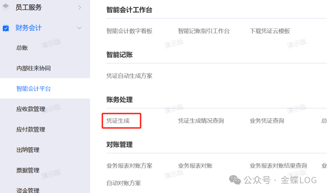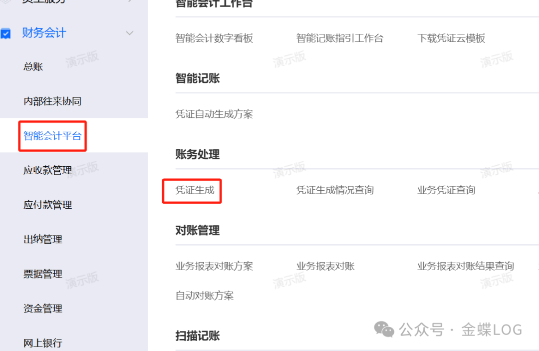 ③智能会计平台生成路径:财务会计-智能会计平台-凭证生成 这个地方是比较推荐的,因为它涵盖了系统的所有单据;其他方式你可以不清楚,这个一定要知道。