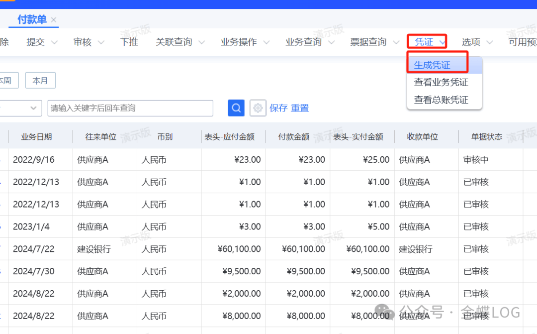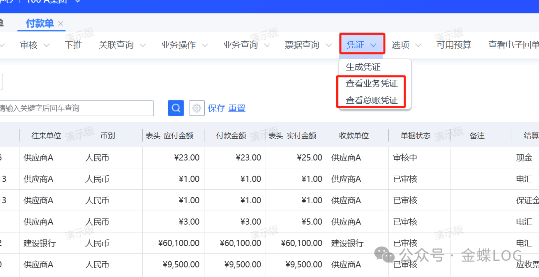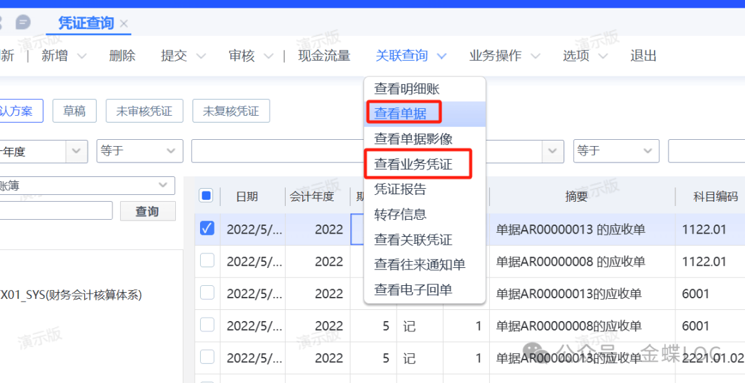 ①通过单据列表【凭证】按钮进行查看单据列表【凭证】按钮里面,有【查看业务凭证】和【查看总账凭证】的按钮。这样就可以通过单据去联查对应凭证。 当然不是所有单据都有这个按钮,没有的也要进行配置。