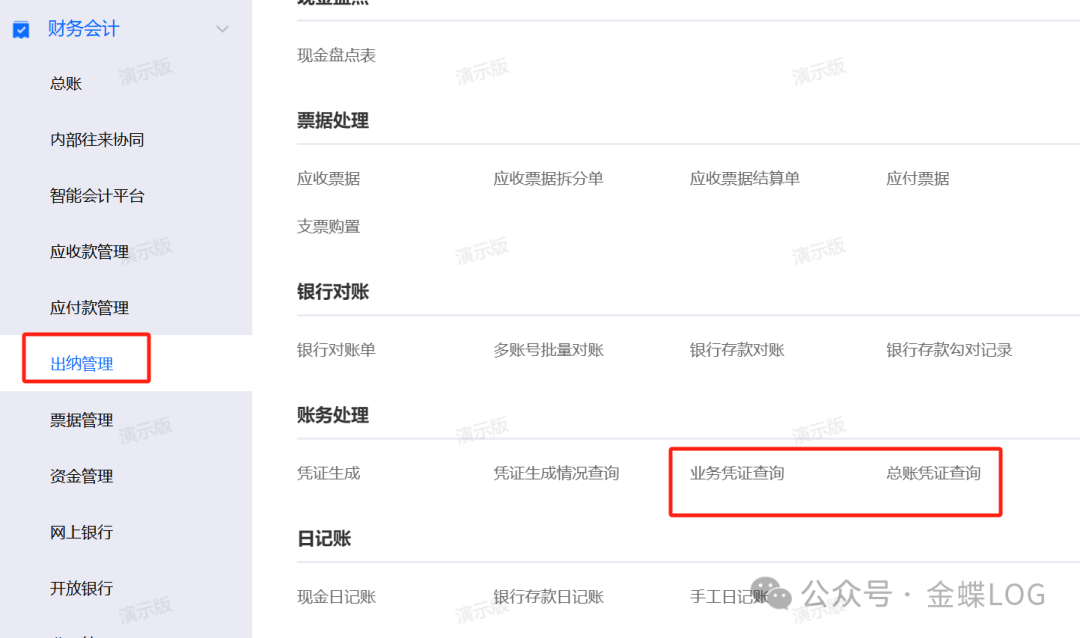 ②通过各模块里的凭证查询功能查看跟凭证生成功能一样,系统一些模块里面会有【业务凭证查询】和【总账凭证查询】的功能。 从这里查询出来的凭证就是对应模块单据所生成的,比如出纳模块点的查询不会出现应付单的凭证。