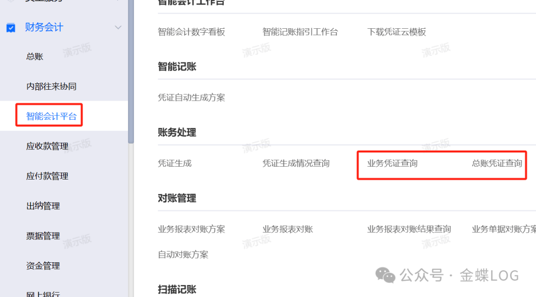 ③智能会计平台查看凭证路径:财务会计-智能会计平台-总账凭证查询 这里查询出来的凭证就是所有模块的数据,跟下面第④个总账路径查出来的数据是一样,只是这里多了一个【业务凭证的查询】。