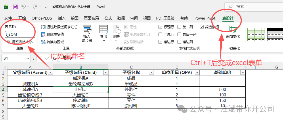 业务解读: 第一层1台减速机A,需要1个齿轮箱B,1个电机C; 第二层1个齿轮箱B,需要2个大齿轮D,1个传动轴E; 第三层1个大齿轮D,需要5kg特种钢材F。 按照连乘逻辑,做1台减速机A,底层实际消耗了:1 × 1 × 2 × 5 = 10kg 的特种钢材F。这个10kg,就是我们要求出的一台减速机A耗费特种钢材的“穿透定额”,这个数据看起来连乘也很轻松算出,但想像一下如果你公司有 5000 个成品,每个成品有5级BOM,共计上百万行数据呢? 不要觉得这需要买几百万的系统,你电脑里自带的 Excel 就能实现降维打击。跟着小编,分四步走。 ①规范原始数据:将上述BOM数据放入Excel。注意:顶级成品(减速机A)的“父级编码”必须为空!选中数据按 Ctrl + T 生成超级表(Excel Table),命名为 t_BOM。