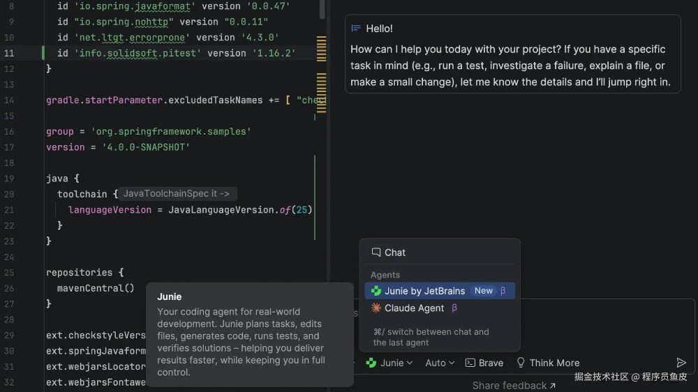 现在,多个代理可以从同一个聊天界面使用,你可以无缝切换,为每个任务获得正确的帮助。除了 Junie,还原生集成了第一个第三方 AI 代理 —— Claude Agent。