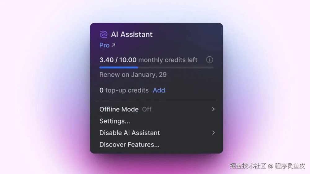 监控和管理 AI 资源变得更容易了,现在可以直接在 IDEA 内查看剩余的 AI Credits、续订日期和充值余额。
