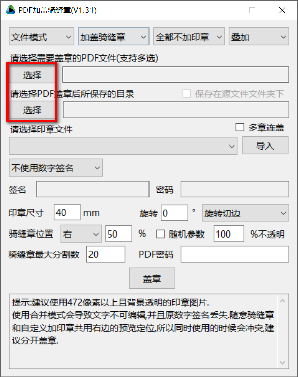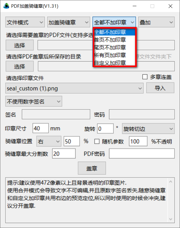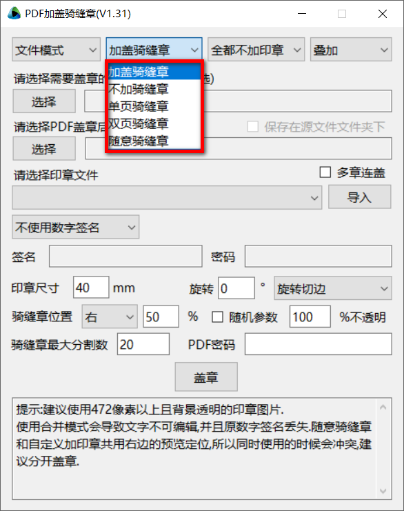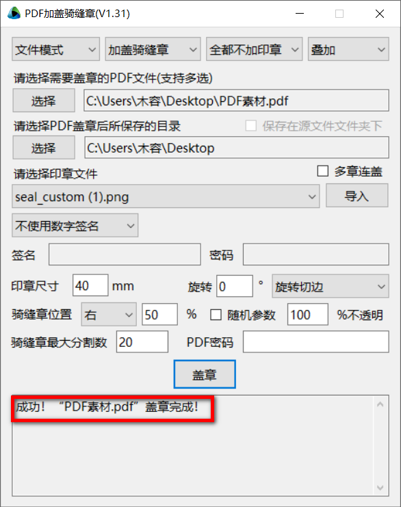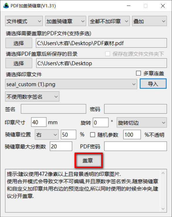 支持添加签名、密码,支持调整印章尺寸,支持印章旋转,支持调整骑缝章位置,支持添加PDF密码,点击盖章即可开始处理。