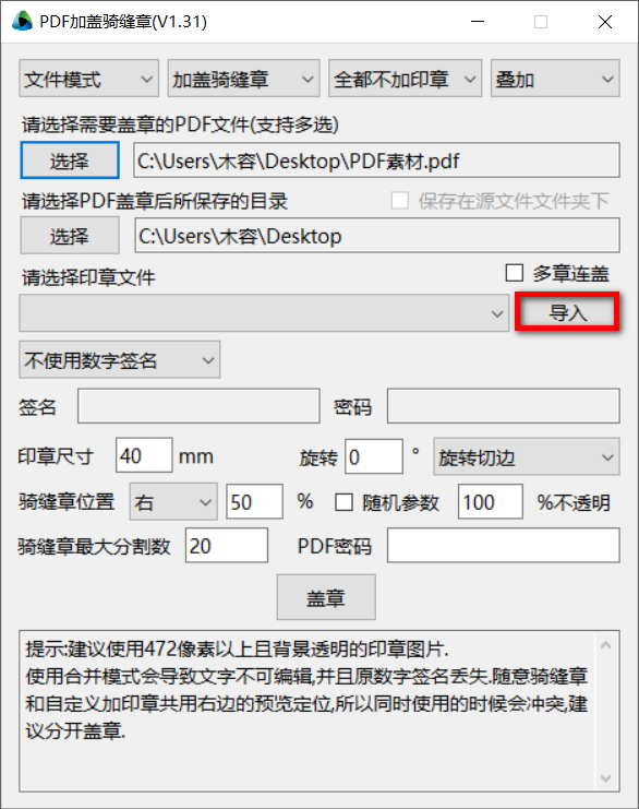 第一步先选择PDF文件和保存路径,支持拖入添加文件,接着导入一下印章文件
