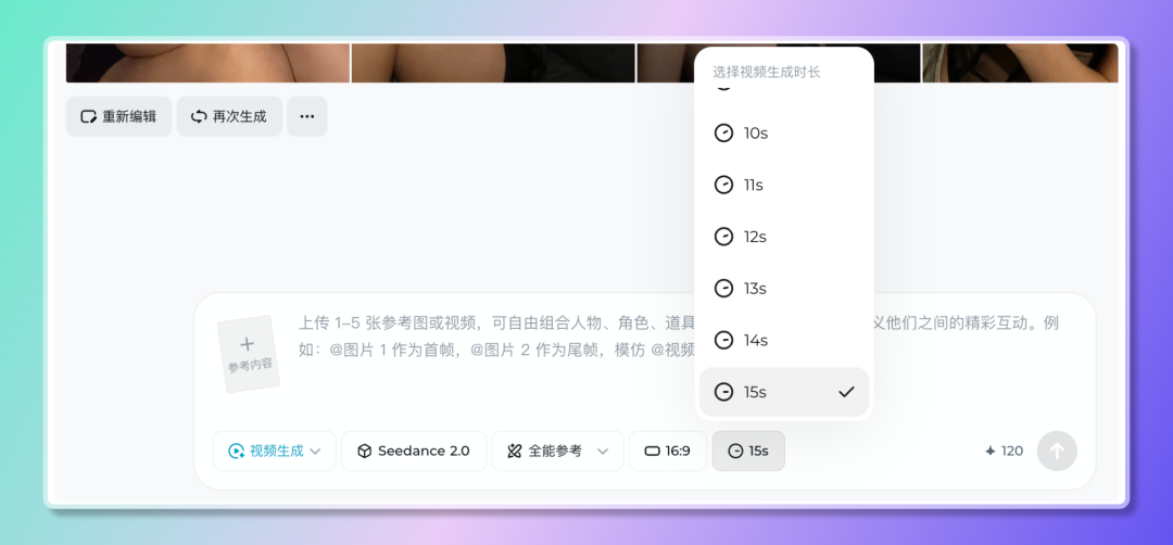 注意:如果你是在做视频延长(比如把一段已有视频往后接 5 秒),那这里选的时长是"新增部分"的时长,不是总时长。想延长 5 秒就选 5 秒。 然后点生成,等结果就好。不满意可以多生成几次,AI本身有随机性,同样的输入每次结果都会有差异,挑最满意的那条。 写在最后Seedance 2.0 刷屏不是没有道理的。它不只是画质变好了、动作更流畅了,更关键的是它改变了AI视频创作的交互方式。 通过多模态输入和@引用机制,创作者第一次能够精准地告诉AI"我要什么",而不是写完提示词然后听天由命。 当然它还在持续进化中,有些极端复杂的场景可能还不够完美。但从目前的能力来看,它已经是一个真正能用在实际创作中的生产力工具了。 建议大家先收藏这篇指南,然后打开即梦动手试试。看别人的作品刷屏不过瘾,自己上手才是真的爽! 以上基于 Seedance 2.0 官方使用手册整理 转自https://blog.csdn.net/m0_62672602/article/details/157912517 该文章在 2026/3/10 11:35:59 编辑过 |