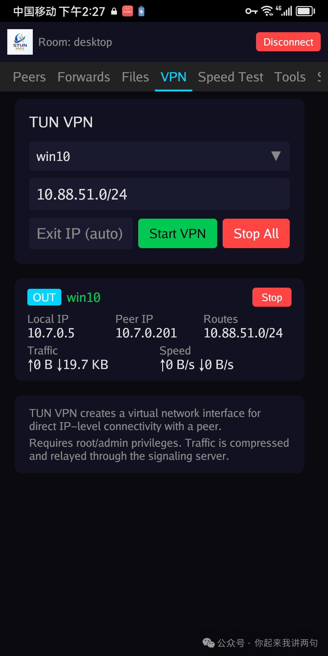 坑 4:Multidex FindClass 失败 Go 生成的 Android 库文件较大,触发了 Multidex 限制。在 Android 5.0 以下版本,必须显式启用 Multidex,否则启动时直接 ClassNotFoundException。 坑 5:APK 构建流水线 Go + Android NDK 交叉编译的工具链配置非常繁琐。最终用 GitHub Actions 搞定了自动化构建,支持 arm64 和 arm32 双架构。整个流程从代码推送到 APK 产出大约 8 分钟。 P2P 核心技术:打洞 + 加密 + 隧道 全链路加密基于 X25519 ECDH + AES-256-GCM。每次建立连接时,双方生成临时密钥对,通过 ECDH 协商出共享密钥,然后用 AES-256-GCM 加密所有隧道数据。即使中转服务器也无法解密内容。 隧道协议设计得很简单:open_tunnel → tunnel_opened → tunnel_data(base64)→ close_tunnel。所有消息都封装在 relay_data 信封里,服务器只负责转发,不解析内容。 gVisor 用户态协议栈是整个 VPN 的基础。它让我不需要系统级权限就能处理 TCP/IP 包,这在 Android 上尤其重要——因为 VpnService 只给你一个原始的 TUN fd,你得自己拆包。 真实场景:我是怎么用的 场景 1:远程访问家里的 NAS 家里的群晖 NAS 在 NAT 后面,没有公网 IP。之前用 frp 转发,但需要一台公网服务器且带宽受限。现在用 STUN Max,两台设备加入同一个房间,P2P 直连,下载速度直接拉满家里的上行带宽。 场景 2:远程开发调试 公司的开发机在内网,在外面用笔记本想访问上面跑的服务。用 STUN Max 把开发机的 8080、3000、22 端口都转发到本地,curl localhost 就能调试。 场景 3:临时文件传输 给朋友传大文件,不想经过云盘。两人打开 STUN Max,加入同一个房间,直接拖拽文件就能 P2P 传输。速度取决于两人的网络,不经过中间服务器。 性能数据
