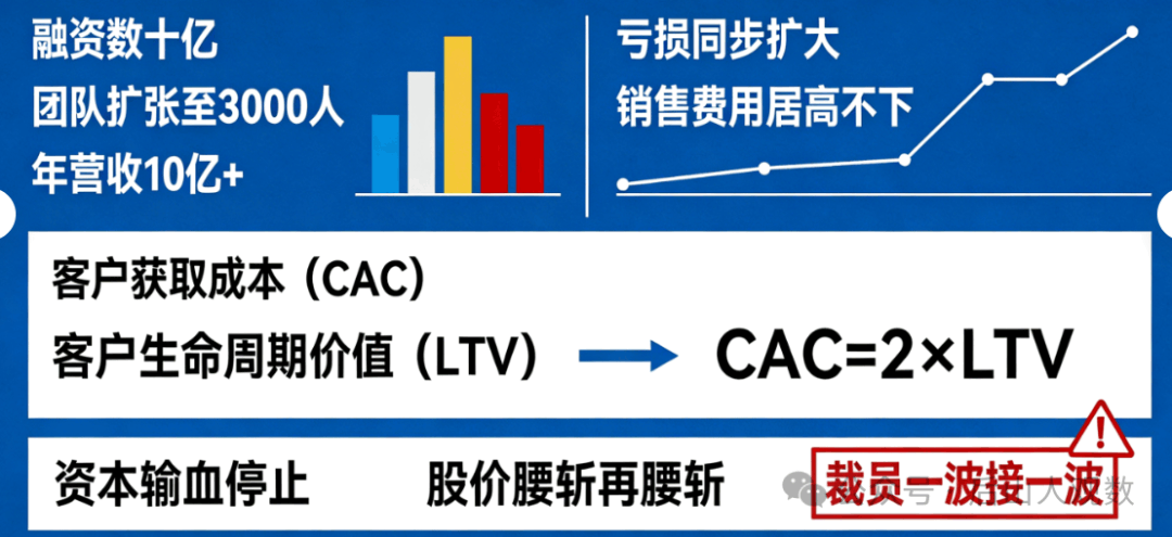 融资数十亿,团队扩张到3000人,年营收做到10亿+,但亏损也在同步扩大。为了维持高增长,销售费用居高不下,客户获取成本(CAC)是客户生命周期价值(LTV)的两倍。资本输血一停,股价腰斩再腰斩,裁员一波接一波。