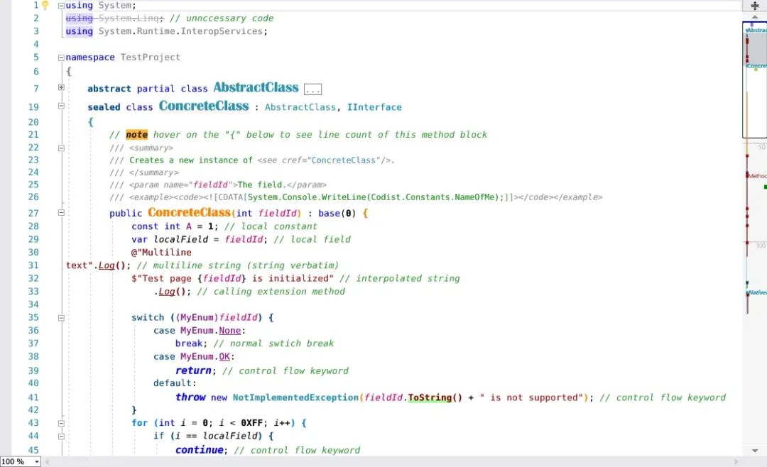 • 显示行号、选择范围、特殊注释、类/结构/接口/枚举声明等标记。