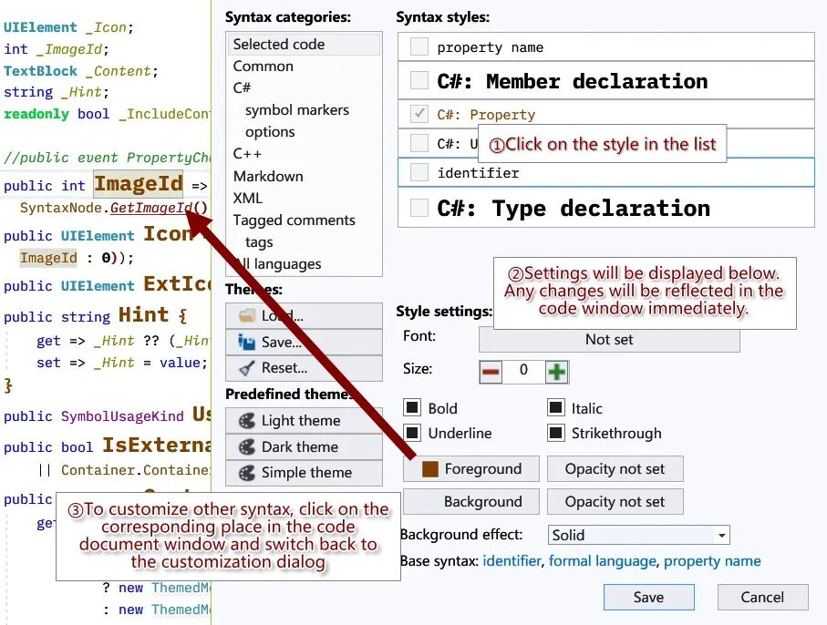 • 功能描述: 支持对 C# 语言元素进行全方位的语法高亮显示,包括各种字体样式、下划线样式、字体大小调整、前景色和背景色更改等。