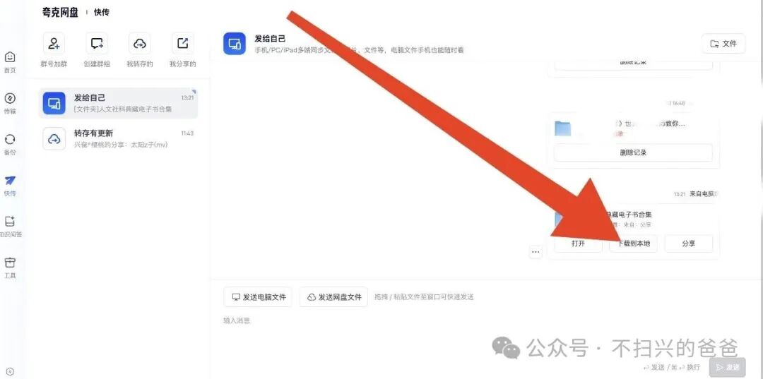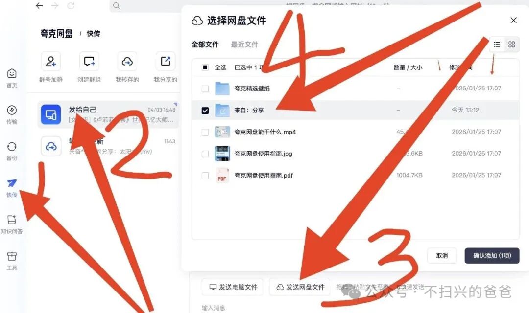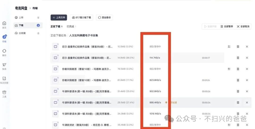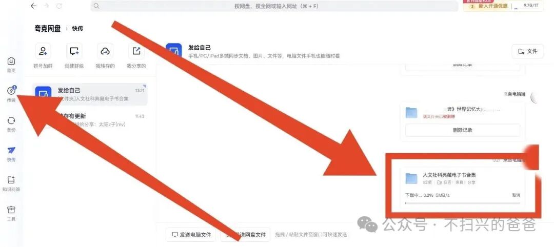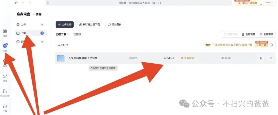 上一篇文章介绍了夸克网盘如何免费扩容至1TB容量(3种办法免费将夸克网盘扩容至1TB),但每次重新免费扩容的有效期只有3个月,网上的资源经常会无端地消失,所以还是下载到自己的硬盘里最保险。但如果不充值,夸克网盘普通用户下载速度一般只有400KB/s,下个电子书还凑合,若下载大文件十分痛苦。我找到了一种办法可以不充值将下载速度提升10多倍且稳定在5MB/s左右(一小时下载17GB左右的资料)。教程如下:1、打开夸克网盘分享的资料链接后点击右下方的“保存到网盘”,注意无需点中间的弹窗的“立即查看”。2、打开夸克网盘的电脑客户端,点击最左侧列表中的位置1处的“快传”按钮,然后选中间位置2处的“发给自己”,在点击右下侧位置3处的“发送网盘文件”。然后会弹出网盘文件,选择位置4处的“来自:分享”。3、在分享文件夹里找到需要下载的资料(如图1所示,我里面只有1个文件夹,故很简洁),再点击位置2处的“确认添加”按钮即可。4、点击右下侧的“下载到本地”,然后在弹窗中选择下载到电脑中你喜欢的位置即可自动进行下载了。5、如右边箭头所示,此时下载速度约为5MB/s。原本左侧列表的“传输”上有新提示(可以不用管,直接在此页面等待下载完毕,我们点开看看)。6、点击左侧“传输”按钮弹出页面,显示正在下载的资料为4.7MB/s(我前后下载了几TB的文件,速度一直很稳定)。7、一般可以同时下载6个左右的文件,每个文件下载速度稳定在800KB/s左右(如下图所示)。PS:这个方法也是我偶尔在网上看到的,我亲测后发现提升明显且稳定后,特意继承大佬的宏愿编辑成此文作为夸克网盘使用技巧的第二篇分享给大家。