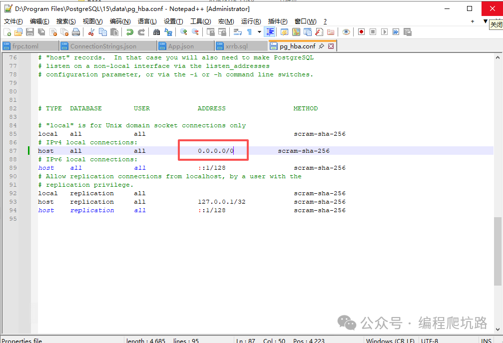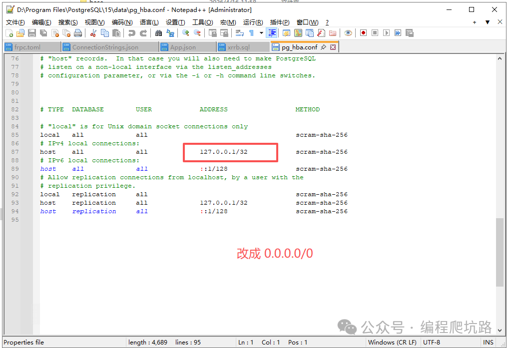 • • 检查 pg_hba.conf 是否改为 0.0.0.0/0