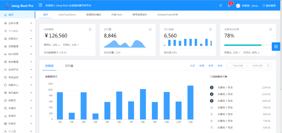 Jeecg-Boot是一款基于SpringBoot+代码生成器的快速开发平台!采用前后端分离架构:SpringBoot,Mybatis,Shiro,JWT,Vue&Ant Design。强大的代码生成器让前端和后台代码一键生成,不需要写任何代码,保持jeecg一贯的强大,绝对是全栈开发福音!!JeecgBoot在提高UI能力的同时,降低了前后分离的开发成本,JeecgBoot还独创在线开发模式(No代码概念),一系列在线智能开发:在线配置表单、在线配置报表、在线图表设计、在线设计流程等等。