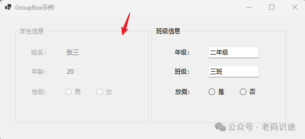 在Form窗体中添加GroupBox,和其他控件一样,可以从工具箱拖动一个GroupBox到Form窗体中,GoupBox作为容器控件,和其他普通单一功能控件一样,具备Size,Location等属性,可以用于设置大小,GoupBox的起始位置等信息。在本示例中,同一个Form窗体中,创建两个GroupBox,分别表示学生信息,班级信息,可以清晰的从视觉上进行区分,如下图所示: ![]() 在上述示例中,学生信息GroupBox中的性别,用RadioButton进行表示,同时班级信息GroupBox中的放假,也用RadionButton进行表示,可以看出同一个GroupBox中的RadioButton是互斥的,如男/女,是/否只能有一个被选中;而分别处在两个GroupBox中的RadioButton则相互独立,互不干扰,如性别的选择,不会影响到放假的选择,这就是容器的另一个作用:程序化分组。 如果GroupBox的Enable属性设置为False,则控件及其子控件均不可用,如下所示: ![]() 注意:GroupBox本身不包含滚动条,如果子控件的位置超过了GroupBox容器的大小,则会自动裁切。 PanelPanel是一个不带标题的面板,此控件和GroupBox功能类似,主要用于为其他控件提供明显的分组。Panel控件的关键属性: