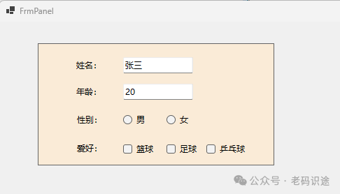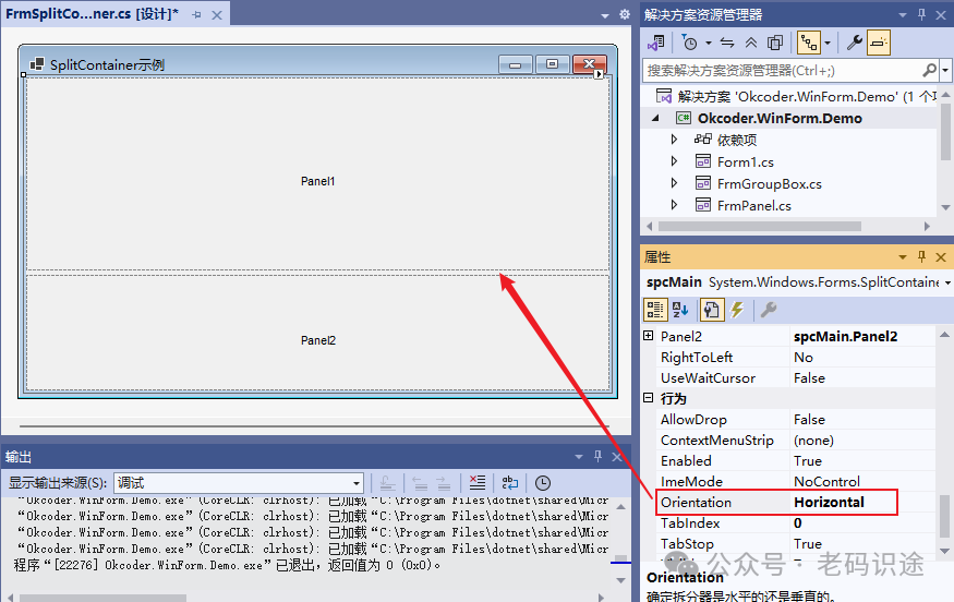 在Visual Studio中进行窗体设计时,Panel控件会有一个虚线边框,用于标识Panel控件的有效范围,如下所示: ![]() 当实际运行起来时,是不带边框的,如下所示: ![]() 如果需要设置Panel容器的边框,可以设置BorderStyle属性,默认为None,表示无边框,设置为纯线(FixedSingle),效果如下所示: ![]() 如果Panel中子控件的位置大于Panel控件的大小,默认是会自动裁切,不显示滚动条;如果需要显示滚动条,则需要设置AutoScroll属性为true,如下所示: ![]() Panel控件设置背景色,同时会将背景色应用到其所包含的子控件中(如:Label,RadioButton,CheckBox等),如下所示: ![]() 如果不想子控件和Panel容器控件背景色保持一致,则需要单独设置子个控件的背景色,如下所示: ![]() 注意:默认添加的Panel控件,是不自动填充到Form窗体中的,如果需要自动填充窗体,则需要设置Panel的Dock属性为Fill。 SplitContainerSplitContainer控件可以被视为一个组合控件,它由一个可移动条分隔成两个面板。 当鼠标指针位于条上时,指针的形状会改变,以指示该条是可移动的。此控件可以创建复杂的用户界面,如上下布局,左右布局等常见形式;SplitContainer关键属性如下所示: