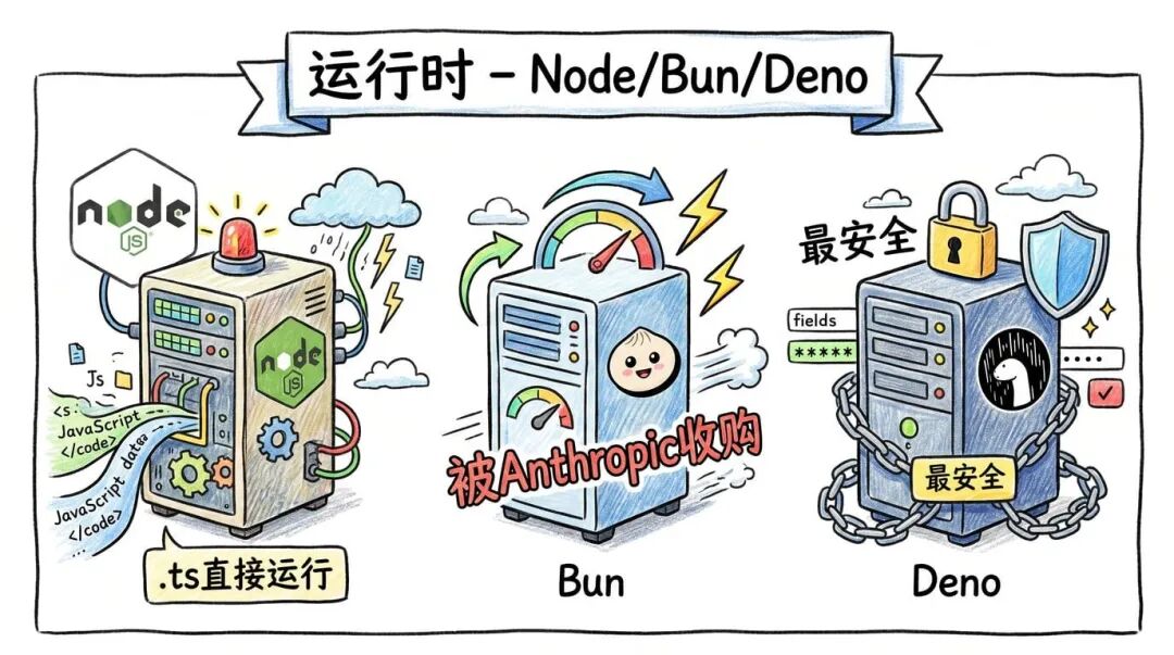 3. JavaScript 运行时:Node 继续领跑,Bun 有了大靠山3.1. Node.js:终于能直接跑 TypeScript 了从 Node 22.18.0 开始,不用再加任何实验性 flag: 直接跑 TypeScript 文件。注意它只是剥离类型,不做类型检查——所以生产环境还是要单独跑 tsc。 Node 这几年的方向很清晰:减少依赖、提升安全性、靠拢浏览器 API。原生测试运行器、内置 SQLite、权限模型……这些功能让它越来越像一个“开箱即用的平台”。 3.2. Bun:被 Anthropic 收购了Bun 1.3 带来了更顺滑的 DX 体验——直接对着 HTML 文件跑,就能得到一个完整的开发服务器: 最重磅的消息是:Bun 被 Anthropic(Claude 的公司)收购了。有了一个资金充裕的稳定靠山,这对 Bun 的长期发展是好事。 速度依然是 Bun 的核心竞争力,只是稳定性方面偶尔会有一些问题。 3.3. Deno 2.0:最安全的选择Deno 最大的优势是安全——默认情况下没有文件系统访问、网络连接、环境变量读取权限,必须显式授权。 如果你要运行不受信任的代码,或者做边缘部署,Deno 是最让人放心的选择。