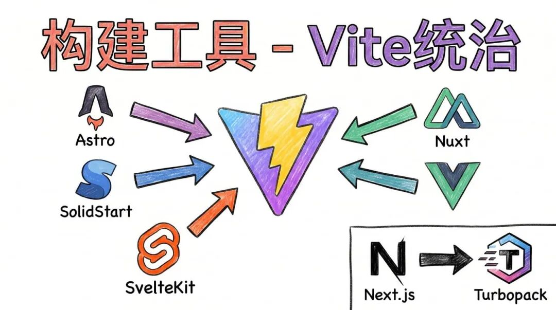 4. 构建工具:Vite 统治一切,Webpack 在努力追赶4.1. Vite:v8 了,还出了个 Vite+Vite 8 是近期最大的版本升级,不再依赖第三方打包工具 Rollup,而是用自己开发的 Rolldown。这一改变让整个工具链更统一、可预测。 Vite 还在往“全家桶”方向走,推出了 Vite+ 概念:一个工具链覆盖开发服务器、格式化、lint、测试、类型检查、打包。同时还在做 Void 平台——一个基于 Cloudflare 的部署平台,数据库、KV、AI 推理、认证、队列……全都内置了。 现在的格局是:几乎所有主流框架都在用 Vite——Astro、SolidStart、SvelteKit、Nuxt、Vue。 唯一的例外是 Next.js,它用 webpack,正在迁移到 Turbopack。 4.2. Turbopack: Next.js v16 的默认打包器Next.js v16 把 Turbopack 设为默认打包器了。Turbopack 是 Vercel 用 Rust 写的,据说比 webpack 快 5-10 倍。不过实际迁移过程中,确实有一些兼容性问题需要处理。 4.3. webpack:2026 年有改进计划webpack 虽然被很多人吐槽“太复杂”,但它依然是大量项目的基础。官方已经发布了 2026 年改进计划,目标就是简化 loader 配置、降低使用门槛。