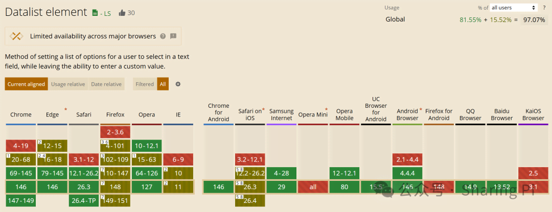 如果你的项目需要兼容老旧浏览器,需提供降级方案(例如回退为普通文本输入框)。建议访问《Can I Use》网站,以及时了解 datalist 属性在各类浏览器中的最新兼容性支持情况。