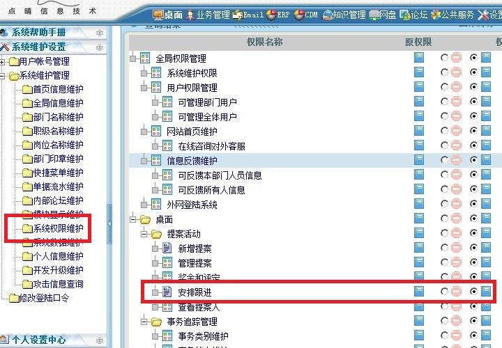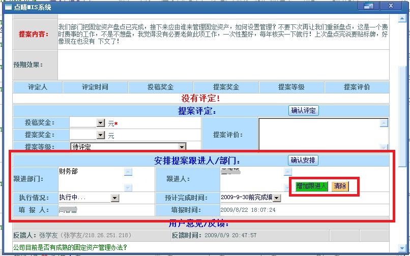 可以安排跟进人的,跟进部门会根据跟进人自动补充的。安排跟进人是受系统权限控制的,要先在点晴MIS系统-》系统维护设置-》系统维护管理-》系统权限维护,找到改善提案部分,开通安排跟进人权限: