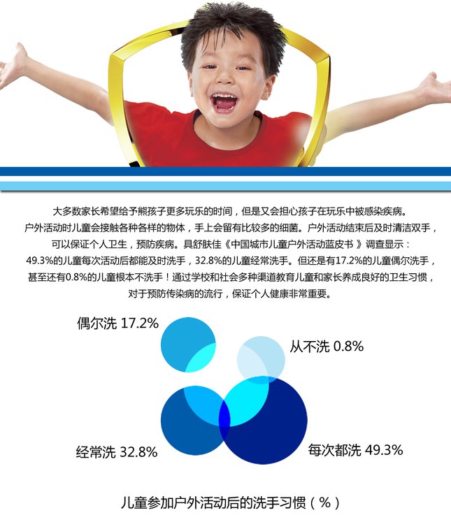研究表明,仅仅是清水和肥皂,皮肤疱疮的发病率就可以下降34%,腹泻的发病率可以下降53%,肺炎的发病率可以下降50%[2][3],而容易在小孩子间传播的手足口病的发病率也会大大降低。 洗手够多了吗?不过洗手这么重要,我们洗手足够多了吗?从世界范围内来讲,仍然有大量欠发达地区居民缺乏洗手的条件和意识,尤其是在儿童中。“国民洗手调查”的调查结果中显示,有49.3%的儿童每次活动后会及时洗手。