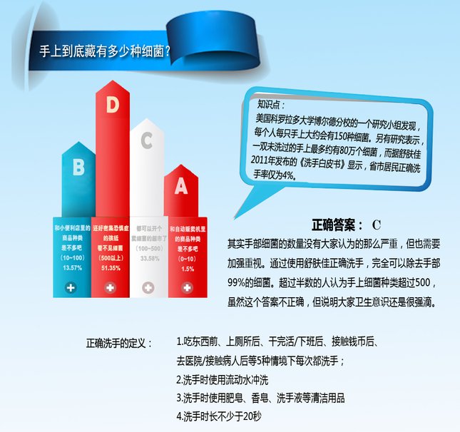 后经匈牙利籍产科大夫伊格纳兹•赛默维斯Ignaz Semmelweis研究发现,一诊区的实习医生通常是刚剖完尸体就赶去接生婴儿——那时候的人认为“一个绅士的手,自然是洁净的”;而产婆们是从来不做尸检的。赛默维斯于是命令医生必须先用漂白粉溶液洗手再接生。这一简单的命令使得产妇产褥热的发病率下降到了之前的十分之一。今天我们知道,产褥热实际上是链球菌造成的,是那些实习医生的手把病菌从尸体带到了产妇身上。谁说绅士的手就是洁净的? 你手上的巨大细菌群那么,即使我们普通人从不像医生那样接触尸体,我们的手上到底有多少细菌呢?据美国科罗拉多大学博尔德分校的一个研究小组发现,每个人每只手上大约会有150种细菌。另有研究表示,一双未洗过的手上最多约有80万个细菌!不过,毋需恐慌,即使有这么多种,数量如此巨大的细菌,通过正确的洗手方法,它们都是可以被去除的。 根据4月初果壳网联合舒肤佳发起的“国民洗手调查”的结果发现:超过50%的人认为手上的细菌超过500种,15%的人认为手部细菌小于15%。,说明大家卫生意识还是很强的。